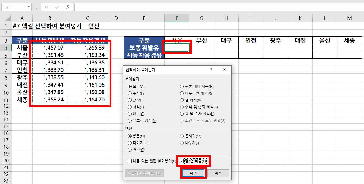 3. 행/열 바꿈(E) 선택 후, 확인 버튼을 클릭합니다.