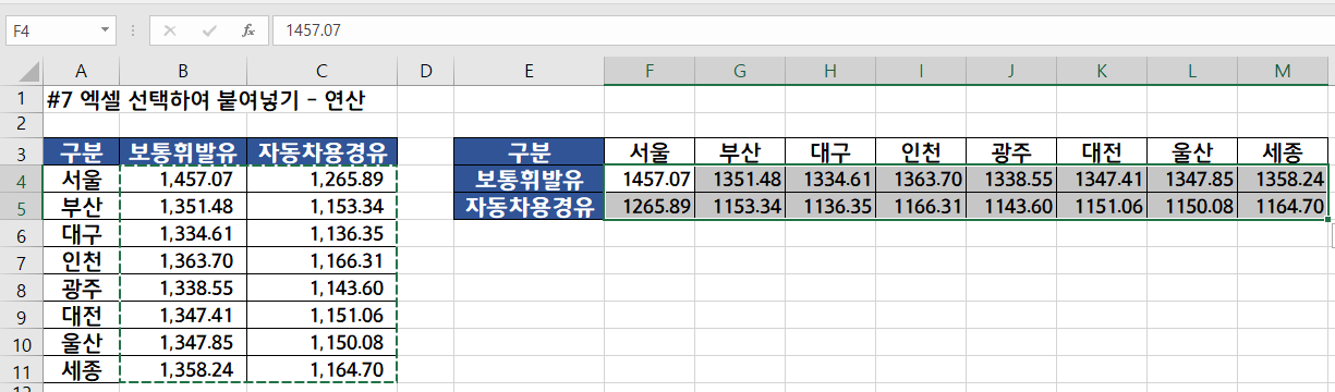 4. F4:M5가 행열이 바꿔진 상태로 채워진 것을 확인할 수 있습니다.