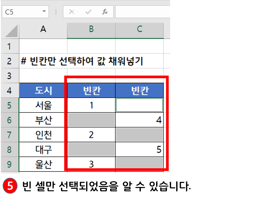 5. 빈셀만 선택되었음을 확인하실 수 있습니다.