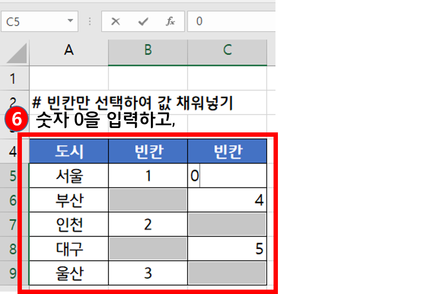6. 선택된 빈 셀 그대로인 상태에서 '0'이라는 숫자를 입력하고,