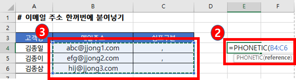 6. 위에서도 말씀드렸듯이, PHONETIC함수가 참조 범위를 합칠 때의 순서는 행의 전체를 먼저 다 합치고, 다음 행으로 넘어가는 방식입니다.