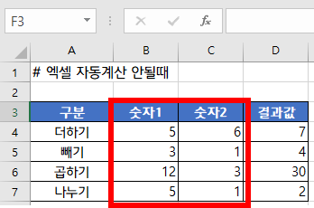 여기서 숫자를 한번 바꿔보겠습니다. 숫자를 다 바꿨는데도, 결과값은 전혀 계산이 되지 않고 있습니다. 수식이 자동으로 계산되지 않는 것은, 자동계산 옵션이 비활성화 되어있기 떄문입니다.