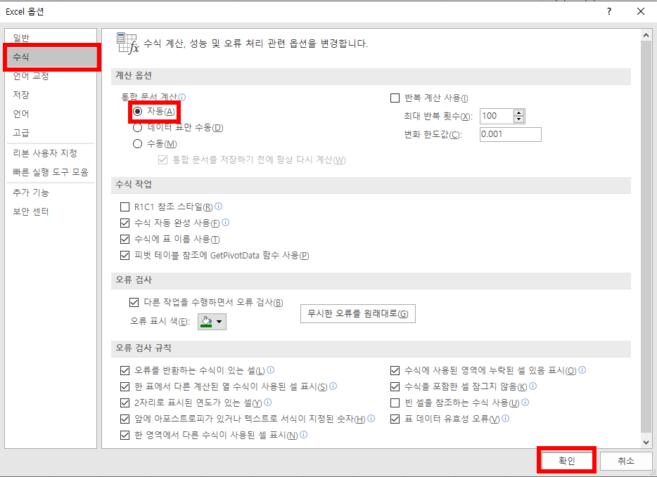 수식으로 들어가서 통합 문서 계산을 자동으로 변경하고 확인을 클릭합니다.