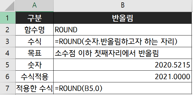 예를 들면 소수점 이하 첫째자리에서 반올림하는 경우 2번째 인수는 '0'이 되고,
