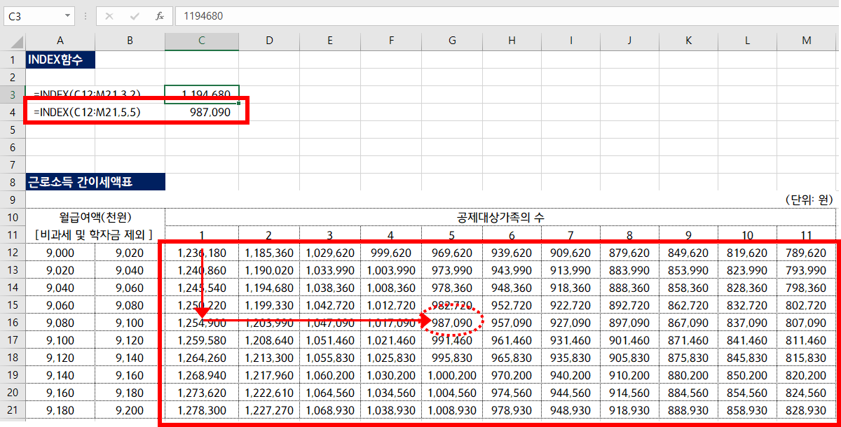 아래의 그림은 근로소득 간이세액표를 발췌하여 INDEX함수를 적용해 보았습니다.
