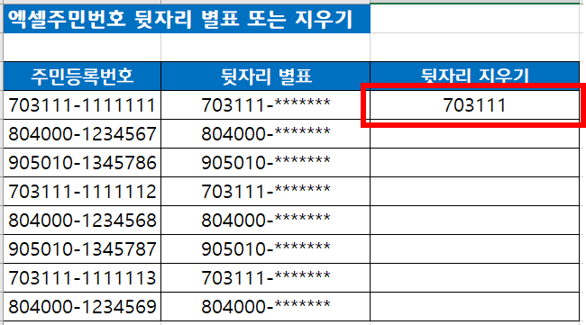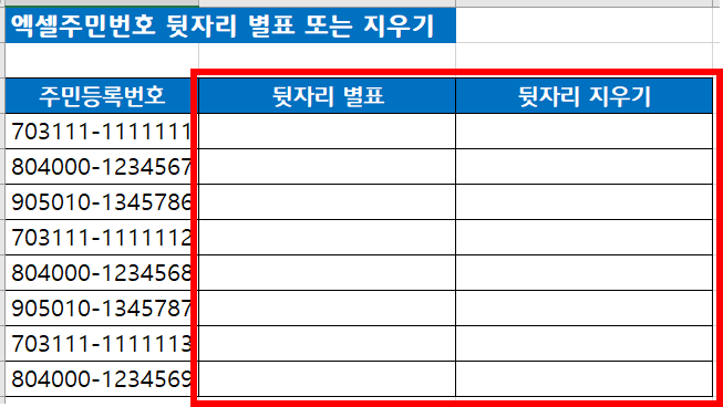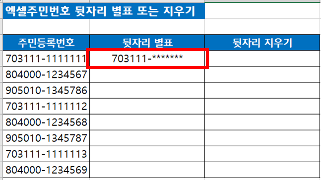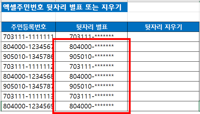 엑셀 주민등록번호 뒷자리 별표 또는 지우기