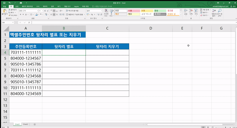 1. 주민등록번호 옆에 빈 열을 추가합니다.