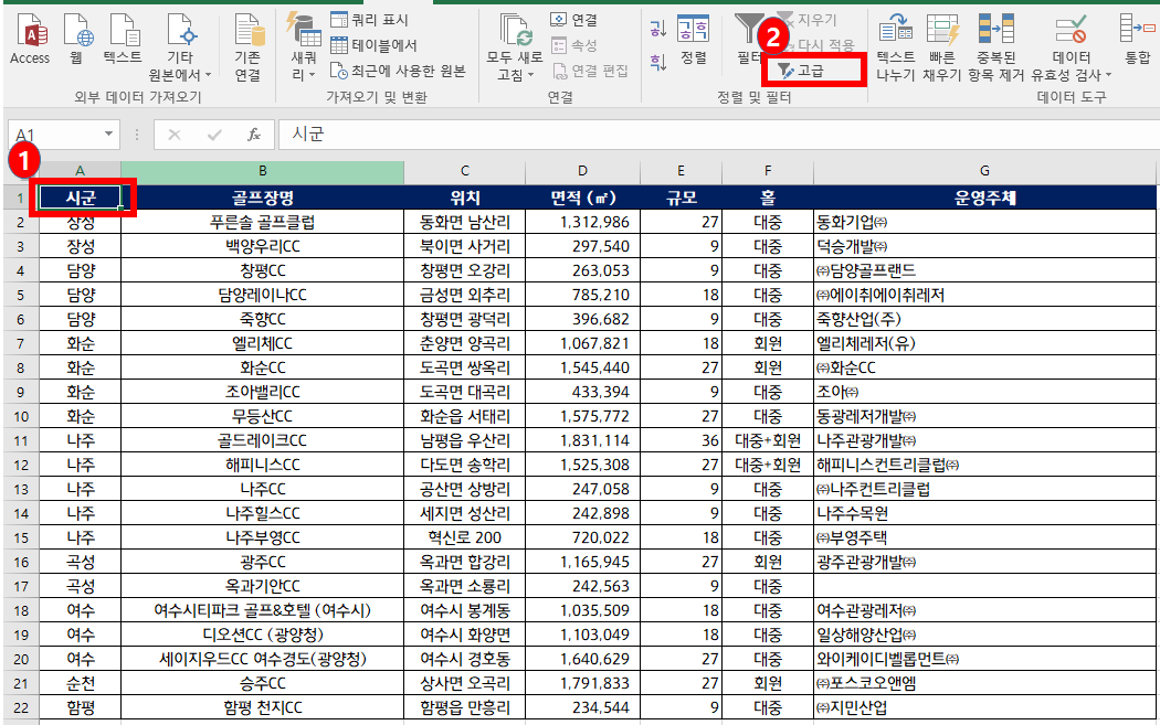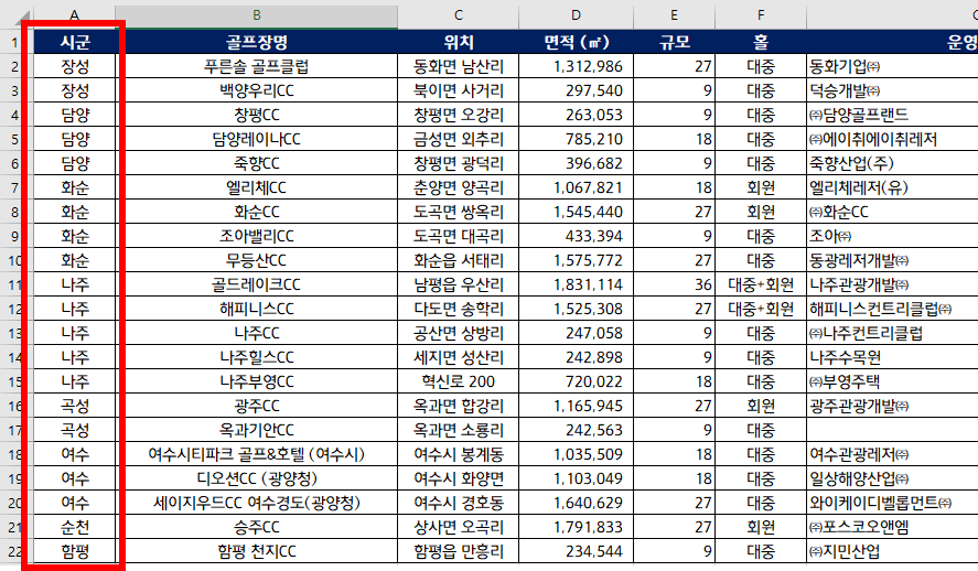 1. 첫번째 열의 '항목명'인 시군(A1셀)을 클릭합니다.