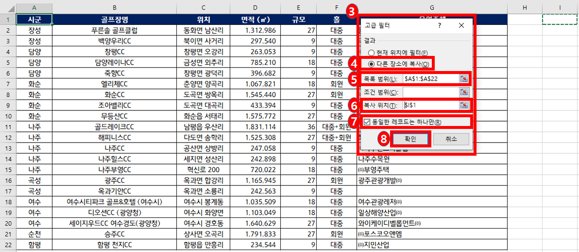 4. 중복된 값을 제외한 고유의 값을 찾으려고 하는 것이기 때문에, 다른 장소에 복사를 체크합니다.