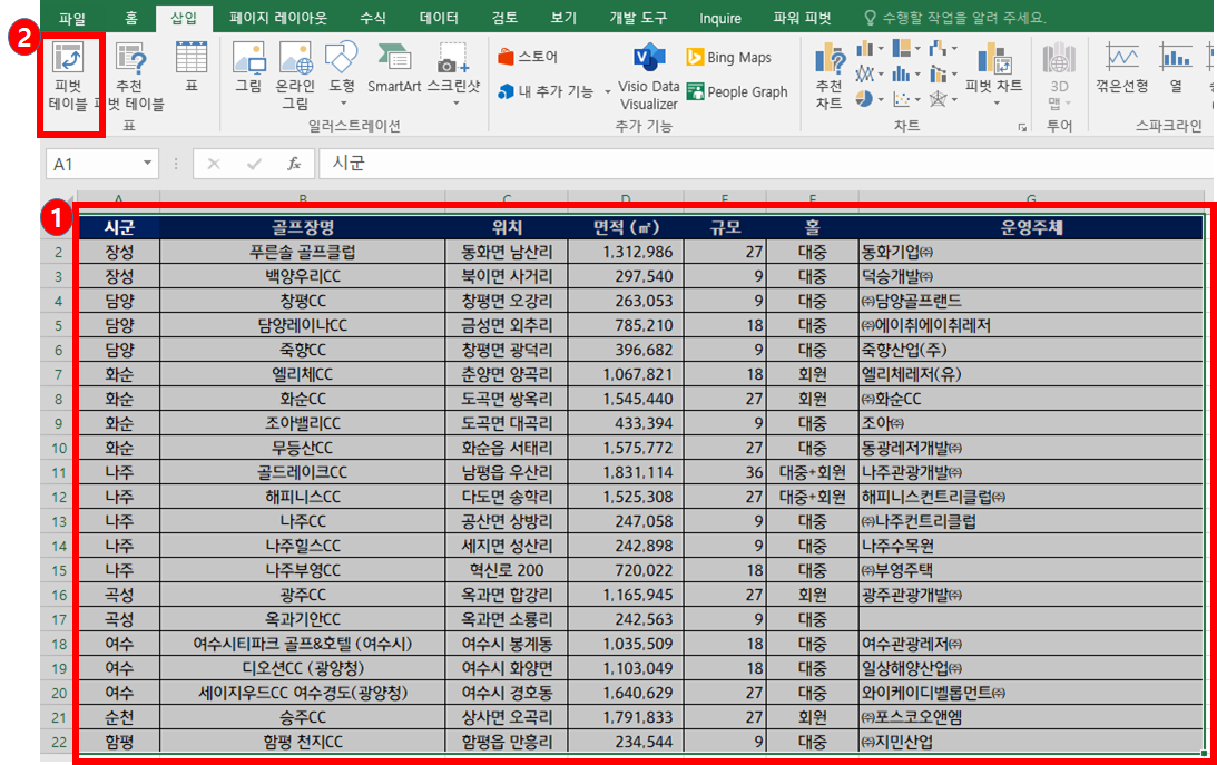 - 전체 테이블을 선택할 필요는 없고, A~B열 2개의 열만 지정해도 되지만 전체 지정하였습니다.