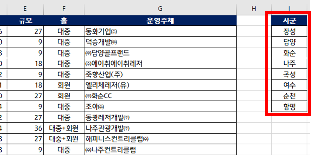 9. I1에 장성, 담양, 화순, 나주, 곡성, 여수, 순천, 함평이 나옵니다. 처음에 생각했던 것과 동일하게 잘 나왔네요.