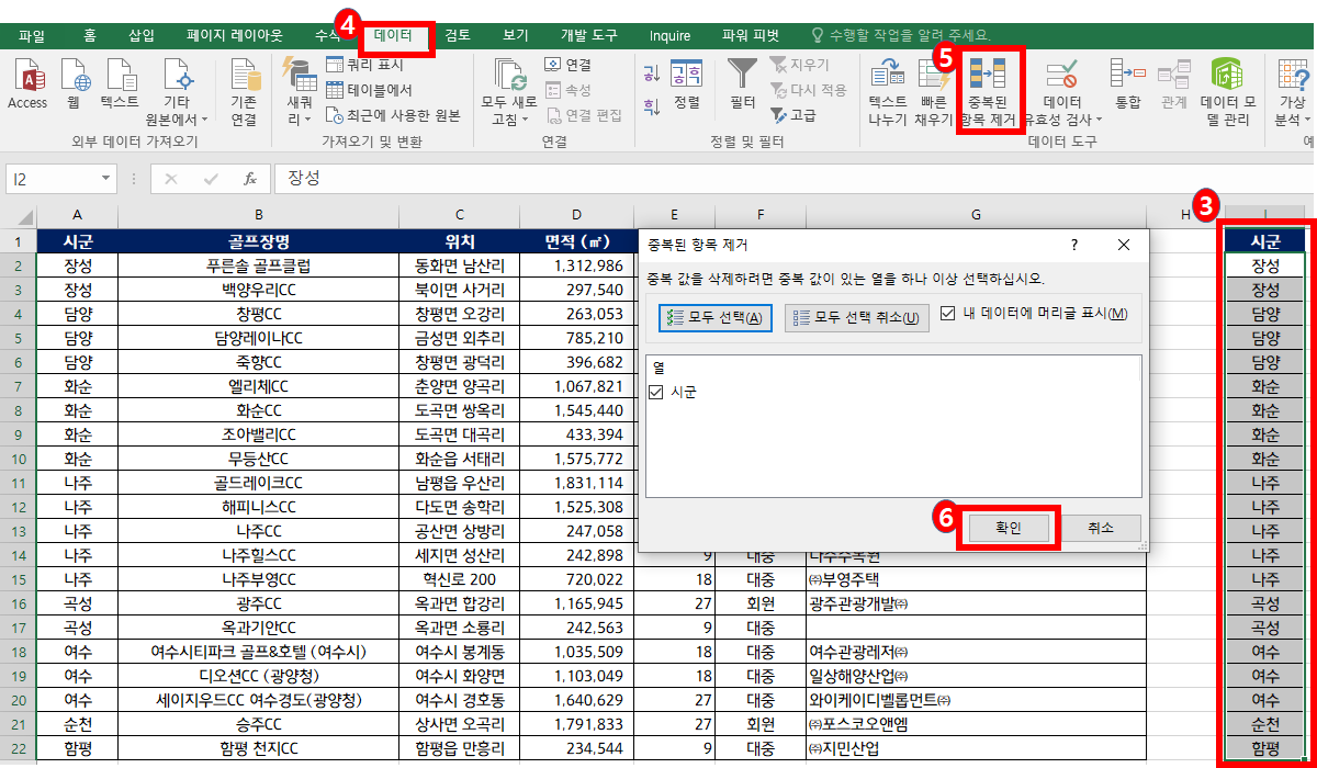 일단 눈으로 찾아보았을 때 '장성, 담양, 화순, 나주, 곡성, 여수, 순천, 함평'이네요. 아래의 방법을 활용했을 때 중복값을 제외한 값들이 동일하게 나오는지 알아보겠습니다.