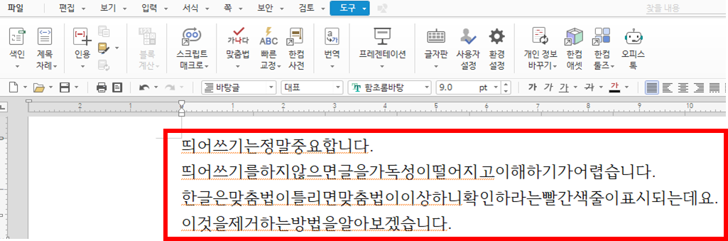 4. 빨간색 줄(맞춤법 도우미)이 사라진 것이 보이시나요?