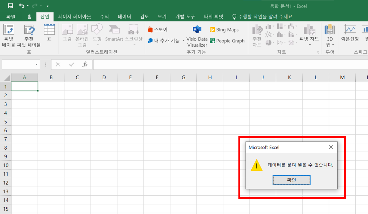엑셀을 사용하시다가, "아래의 그림처럼 데이터를 붙여 넣을 수 없습니다."라는 메세지 박스가 나타난 적이 있으신가요?