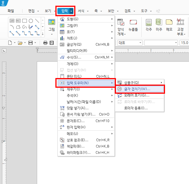 1. 입력-입력도우미-글자 겹치기를 선택합니다.