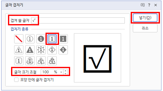 4. 글자 크기 조절(50~150% 가능)은 그대로 두고, 넣기를 클릭하겠습니다.